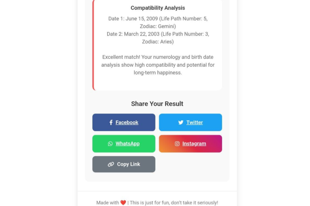 In real life, love, trust, and mutual understanding are the most essential elements for building a strong relationship. Therefore, use this tool merely as a guide rather than accepting it as the absolute truth.